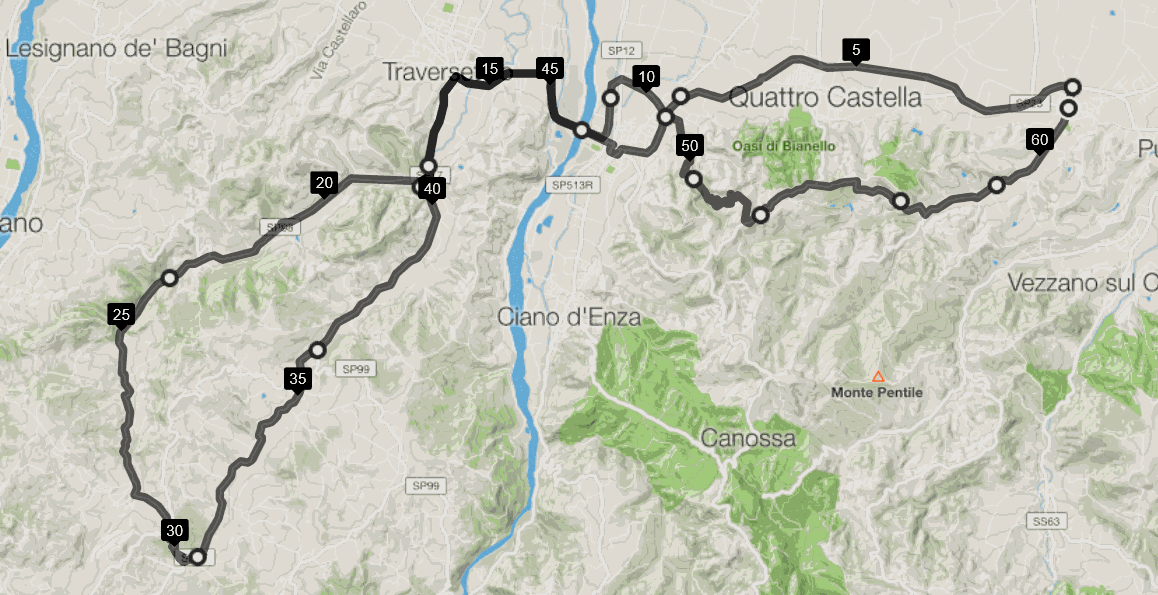MONTECAVOLO-RUBBIANINO-GOLF-GHIARDO-BIBBIANO-MONTECCHIO - BASILICAGOIANO-MONTICELLI-PILASTRELLO-BASILICANOVA-TRAVERSETOLO-S.POLO (BIVIO CORTO) BORSEA-BERGONZANO- QUATTRO CASTELLA -MONTECAVOLO = Km.61PERCORSO CORTO